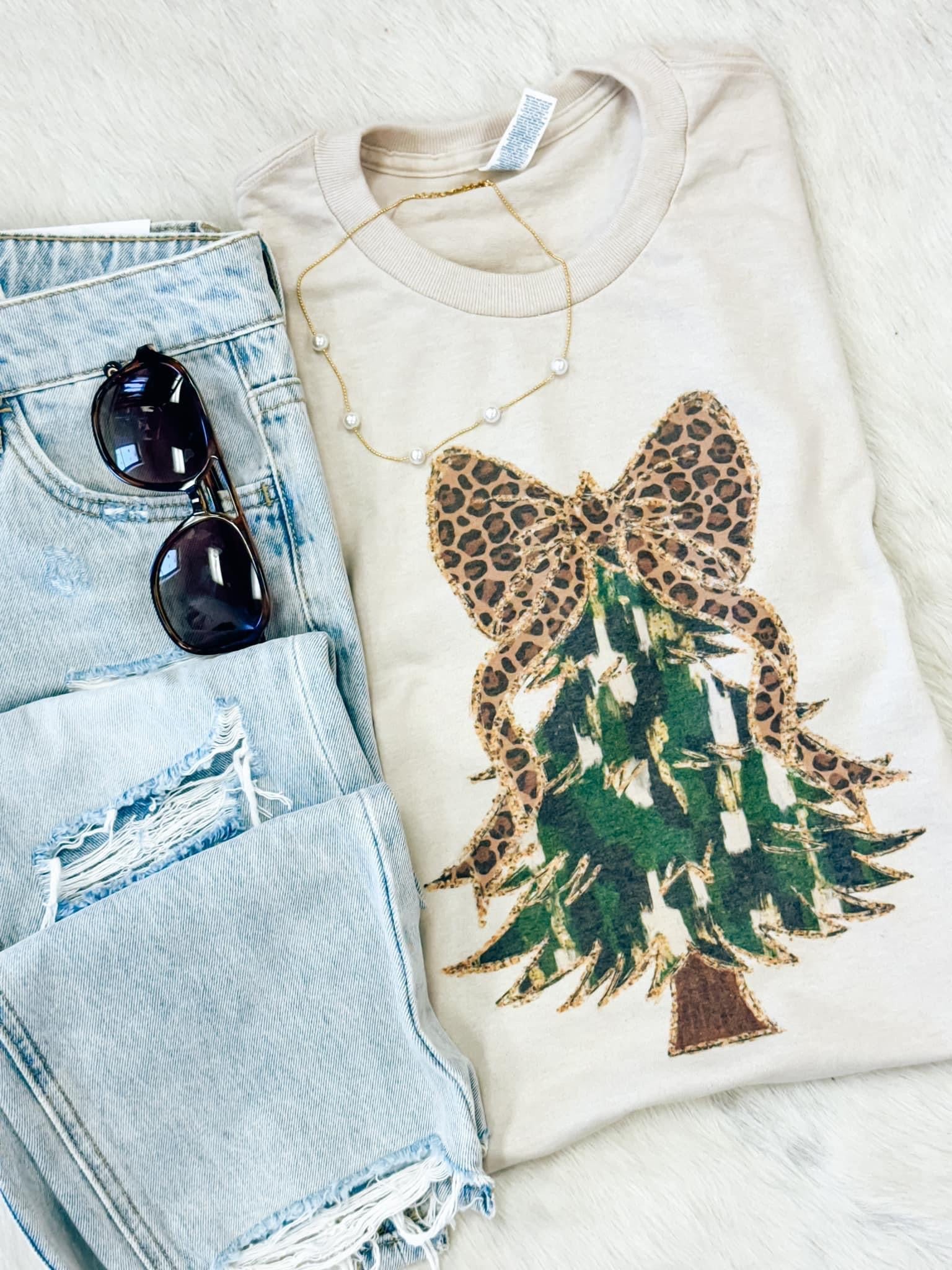 Green Brushstroke Christmas Tree With Leopard Bow
